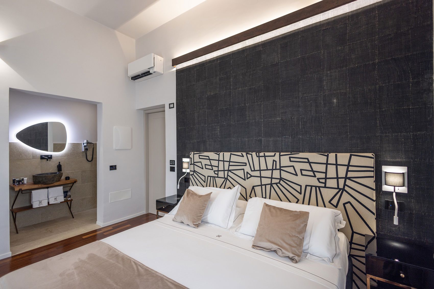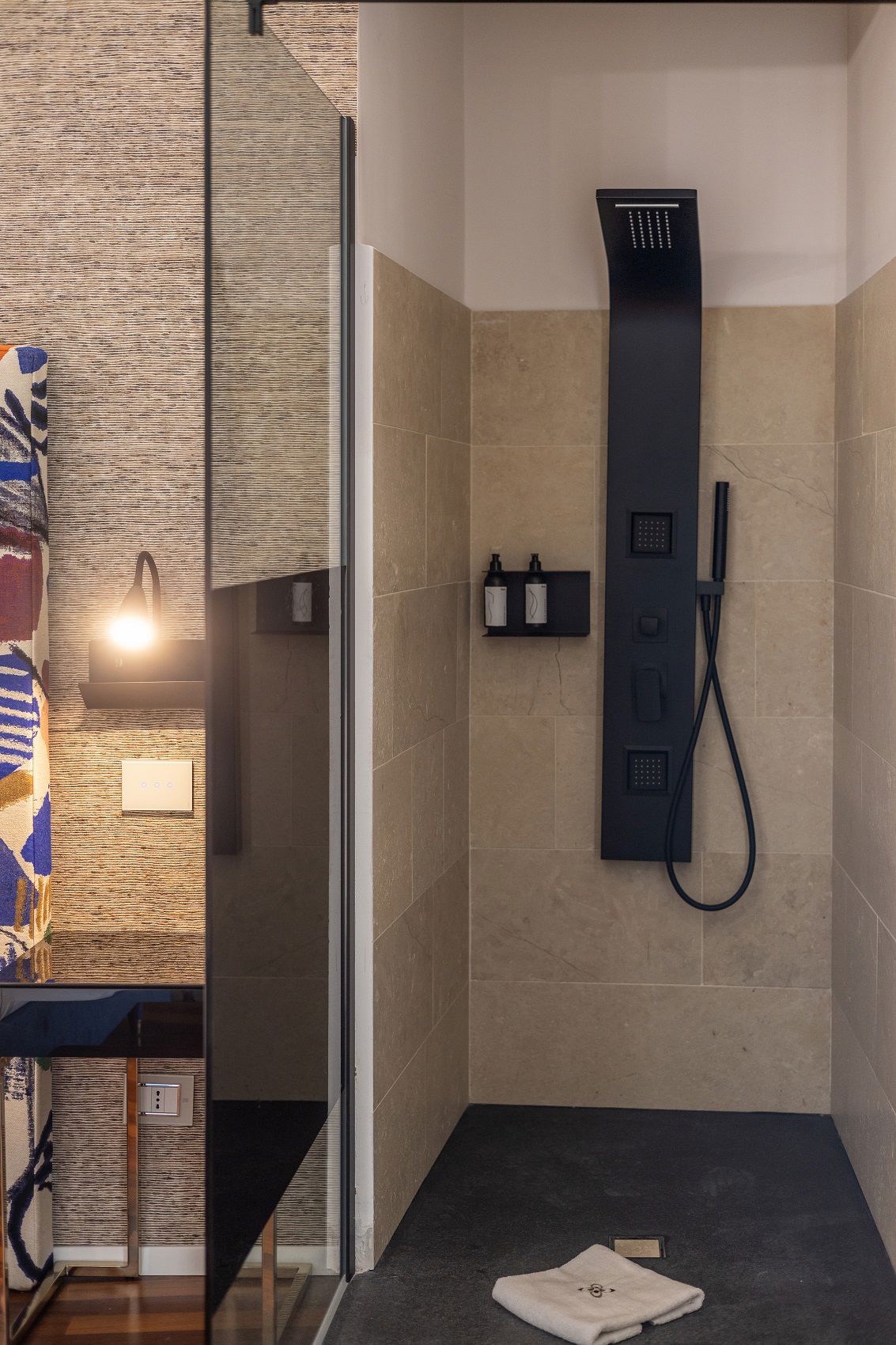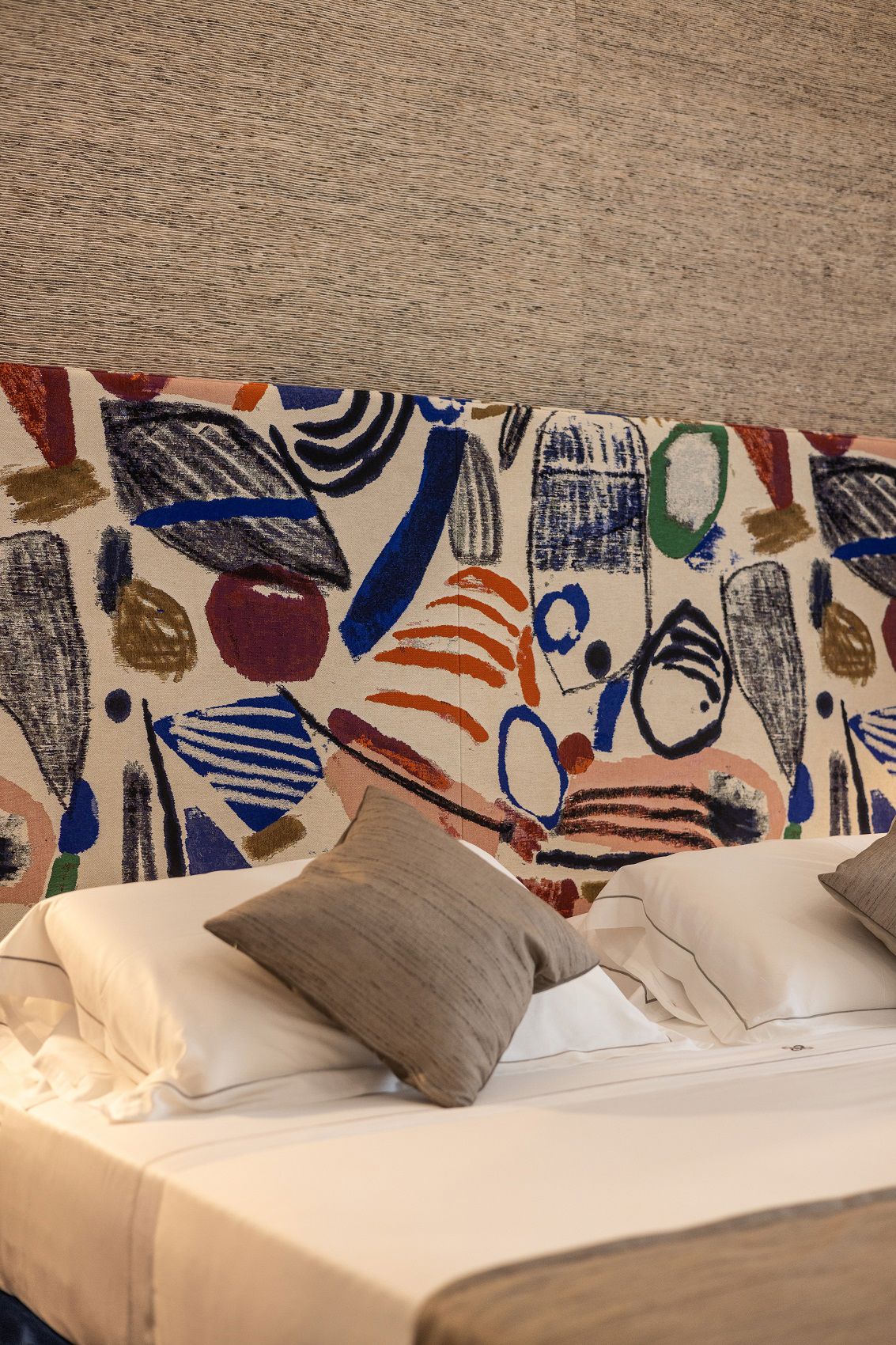 Inside, every detail tells a story where art, fabric, and light intertwine. Headboards and drapes by Pierre Frey and Jim Thompson set the tone: luxurious yarns, velvety chenille, graphic jacquards, and artistic reimaginings—like “Le Toile du Peintre” and the abstract “La Sorgue”—converse with textured wallpaper that evokes bark, wood, and mother-of-pearl through layered patterns and natural light play.