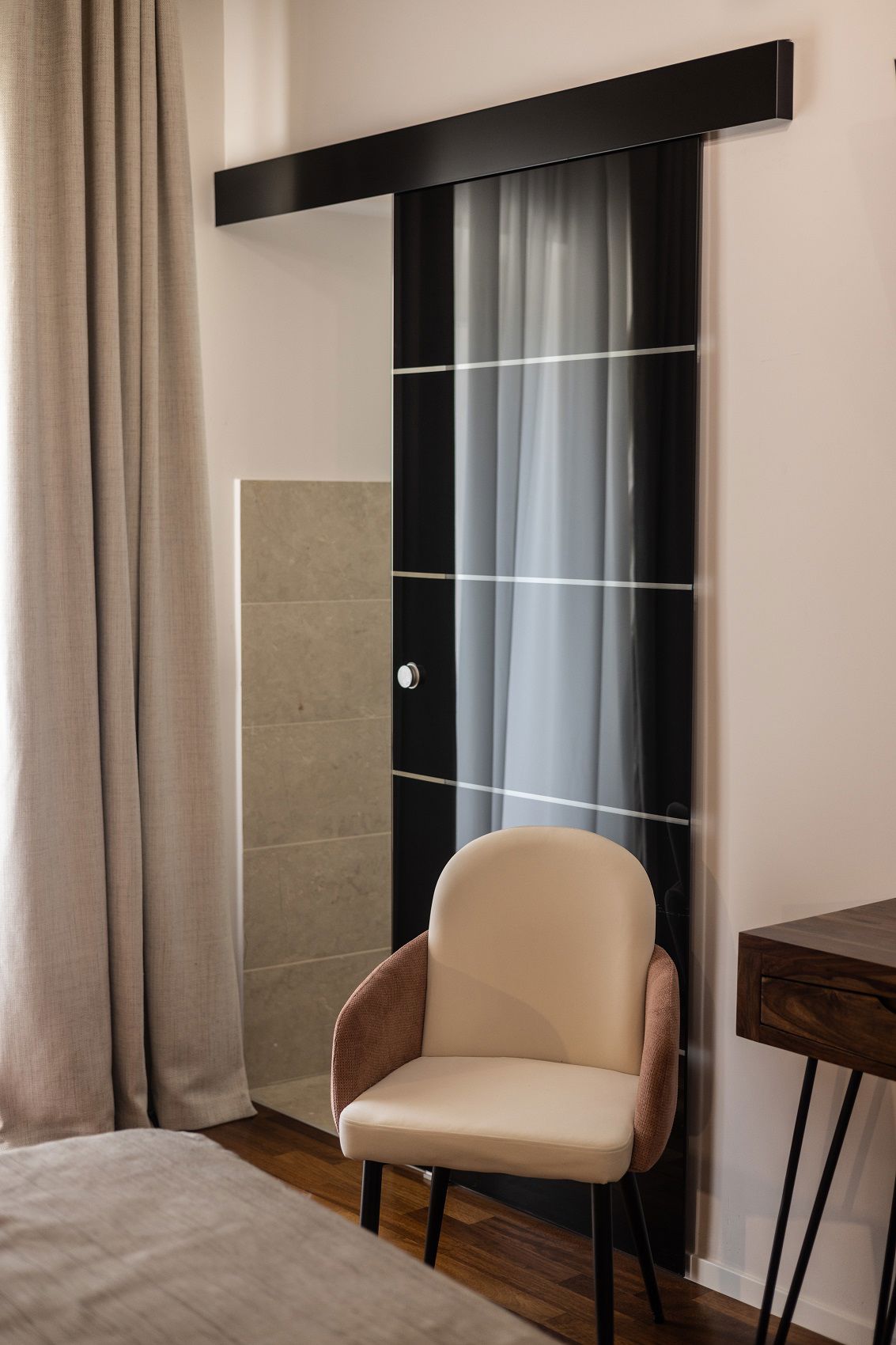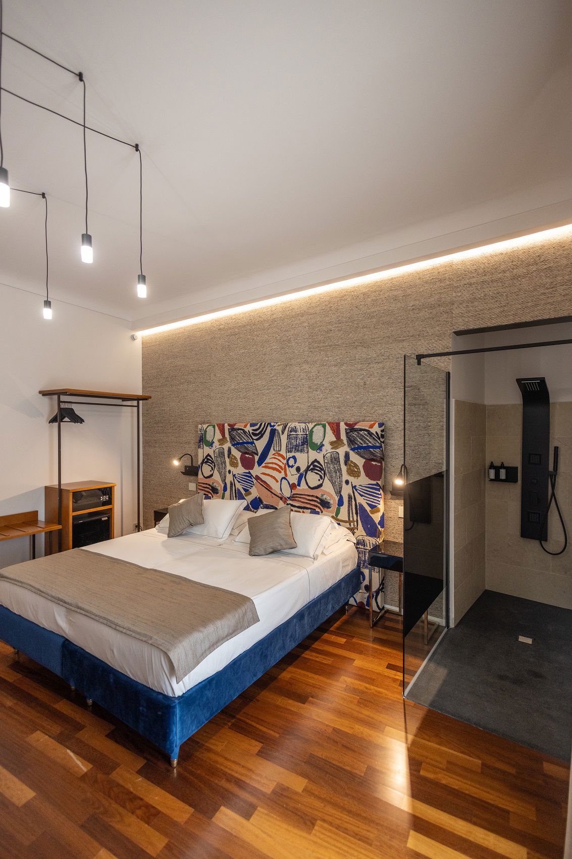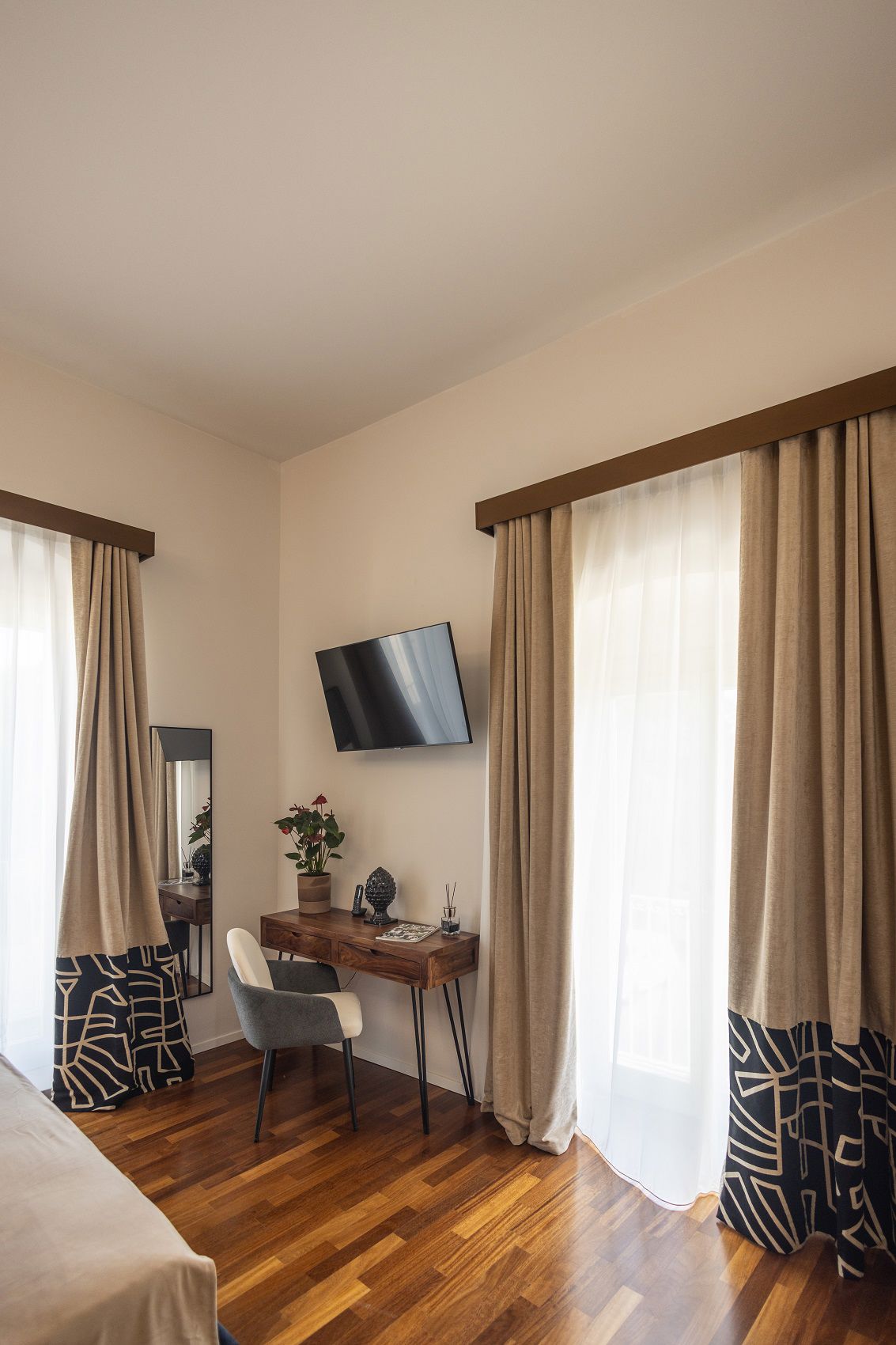 Inside, every detail tells a story where art, fabric, and light intertwine. Headboards and drapes by Pierre Frey and Jim Thompson set the tone: luxurious yarns, velvety chenille, graphic jacquards, and artistic reimaginings—like “Le Toile du Peintre” and the abstract “La Sorgue”—converse with textured wallpaper that evokes bark, wood, and mother-of-pearl through layered patterns and natural light play.