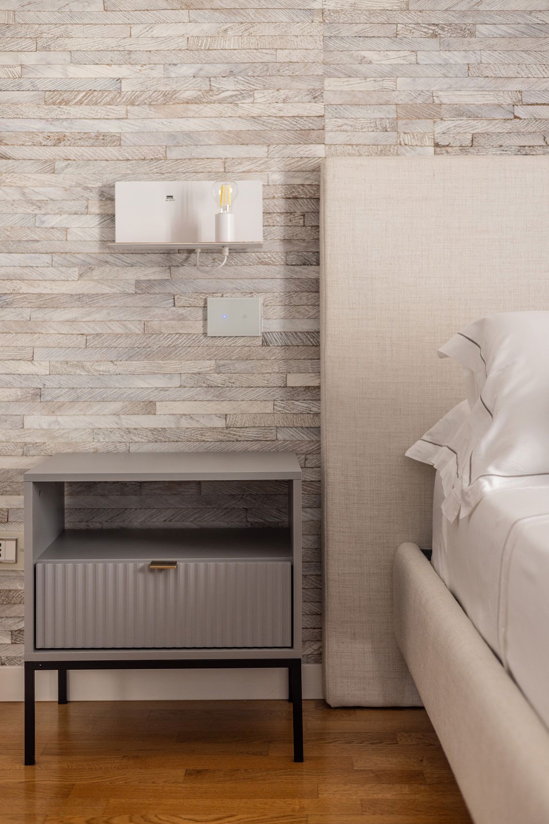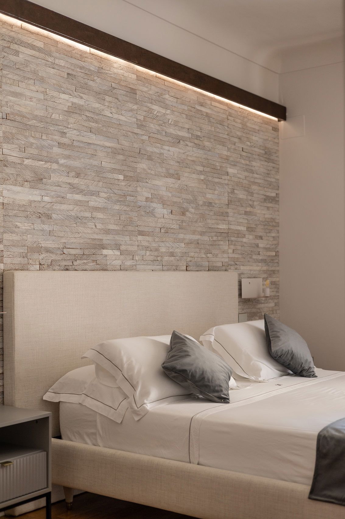 Gli interni raccontano un’estetica calda e sofisticata: la carta da parati in corteccia di cocco di Élitis avvolge le pareti con texture naturali e irregolari, mentre la testata e le tende “Angkor” di Pierre Frey aggiungono una nota di eleganza.