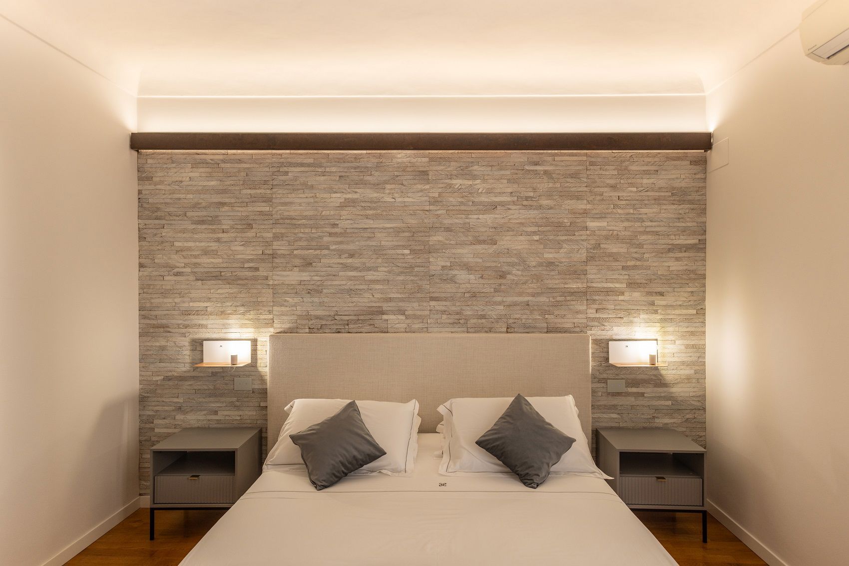 Una camera pensata per chi desidera concedersi tempo, tra comfort moderni e dettagli materici dal sapore esotico. Il letto king size accoglie in una stanza luminosa, con balcone affacciato sulla scenografica Porta Reale di Noto.