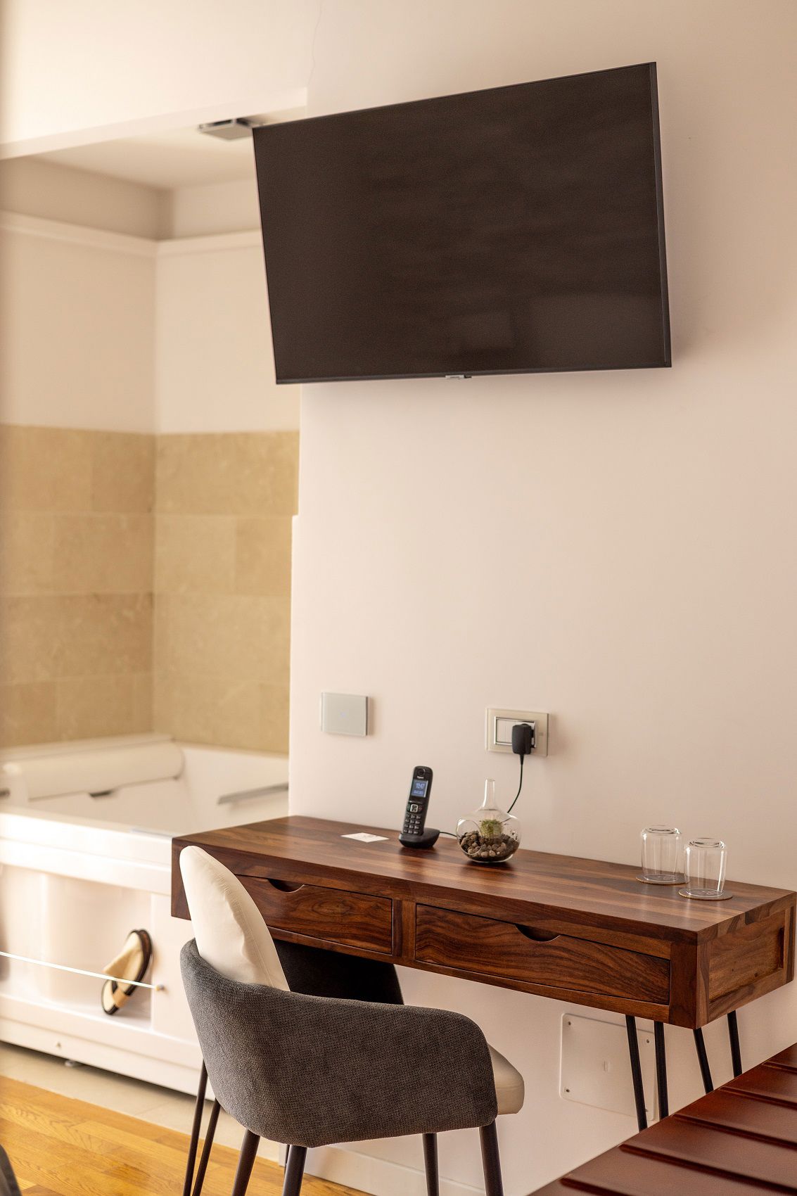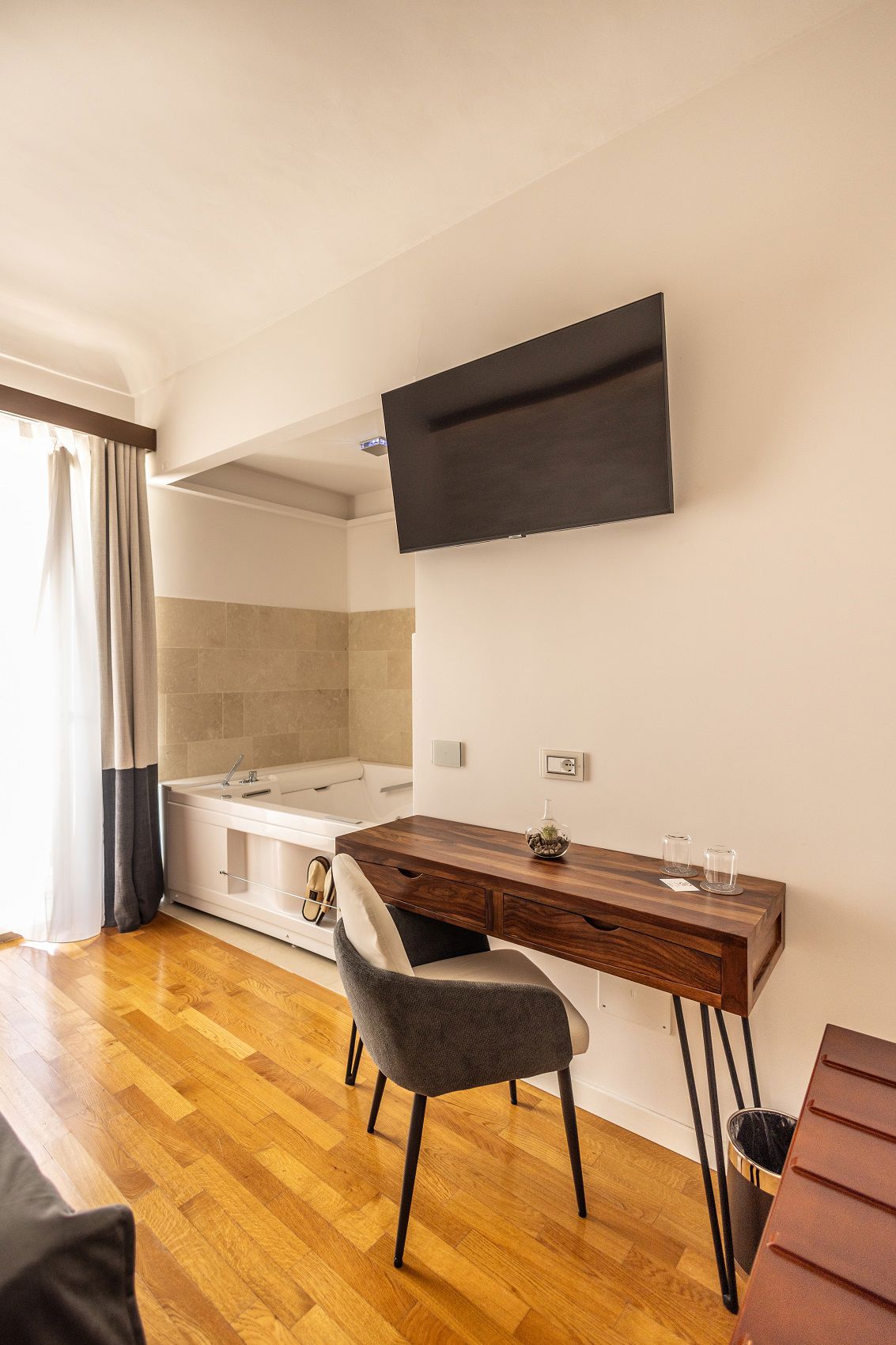 Il vero lusso è prendersi una pausa: la vasca idromassaggio invita a un rituale di benessere, mentre ogni dettaglio – dai tessuti alla selezione ecologica dei prodotti di cortesia – riflette una filosofia attenta e curata.