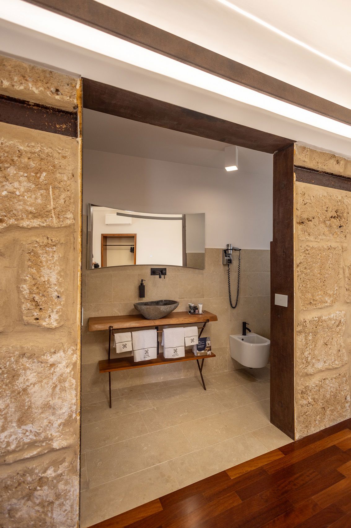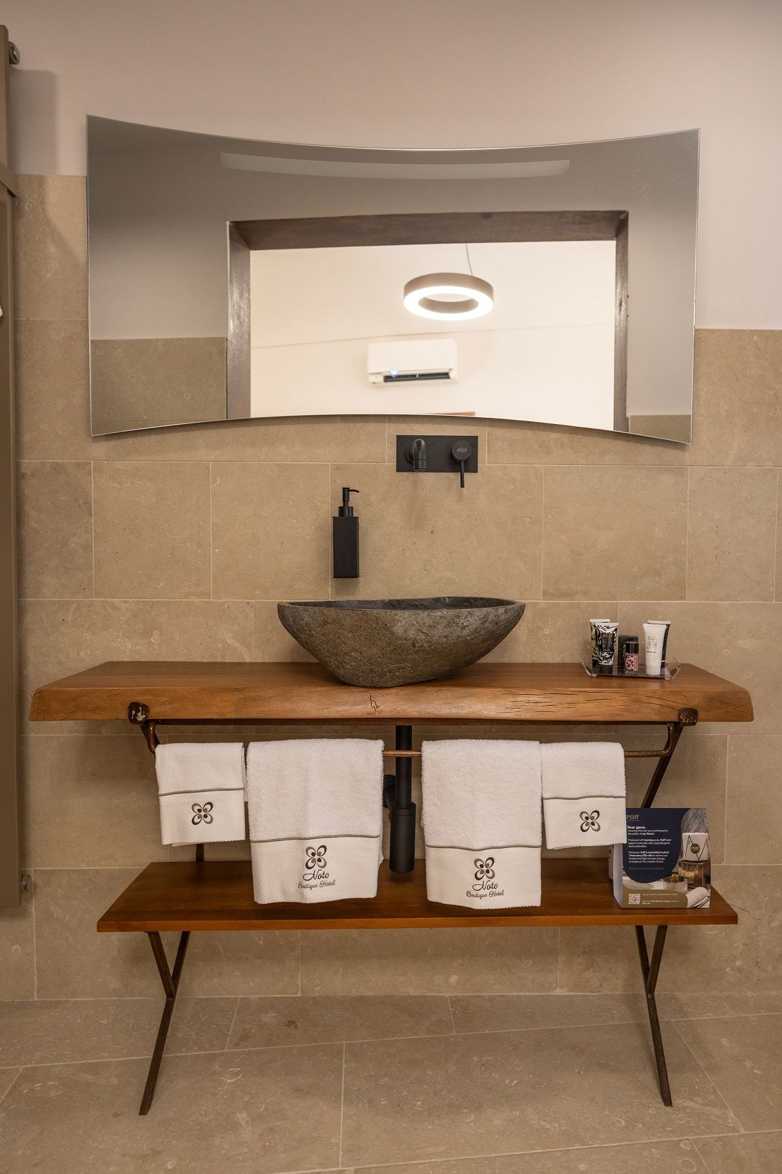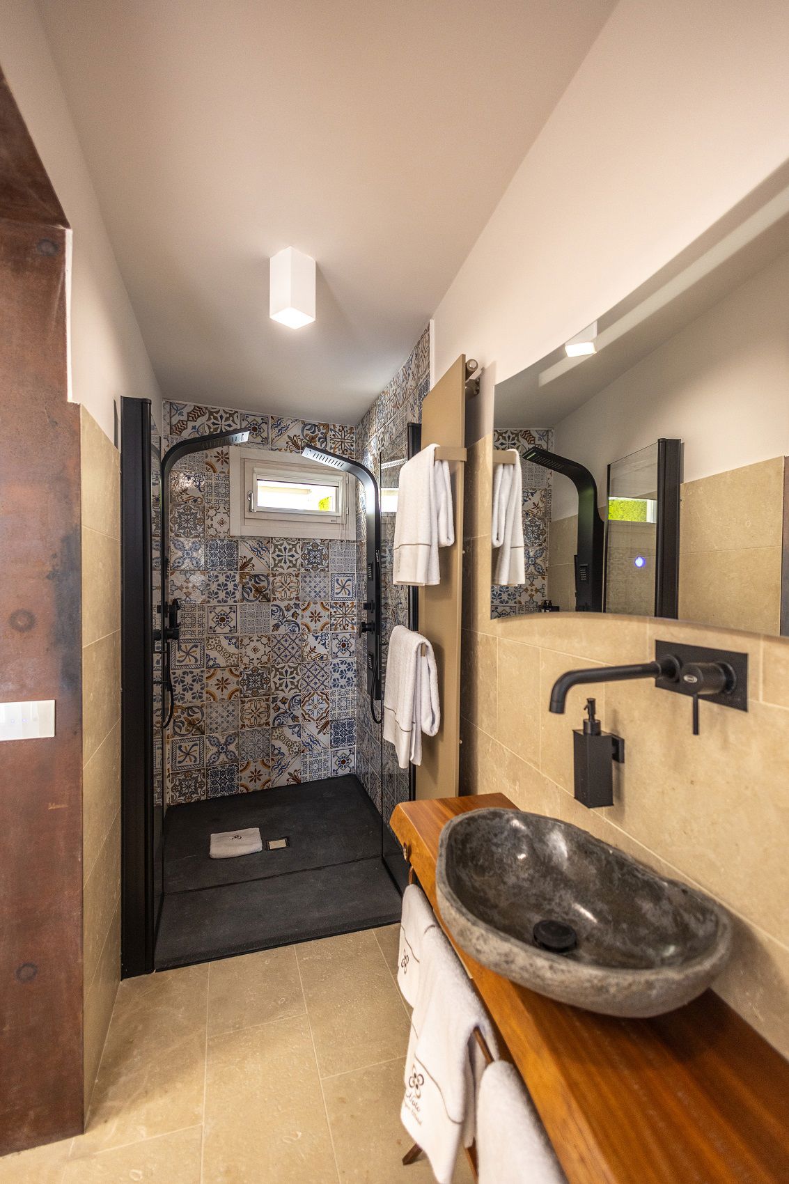 La vasca idromassaggio offre un’esperienza rigenerante, mentre il concept sostenibile della stanza si riflette nella scelta dei prodotti di cortesia, disponibili sia in versione monouso che in pratici distributori. L’attenzione all’ambiente prosegue con l’uso della carta igienica PAFF, realizzata in bambù e completamente biodegradabile.