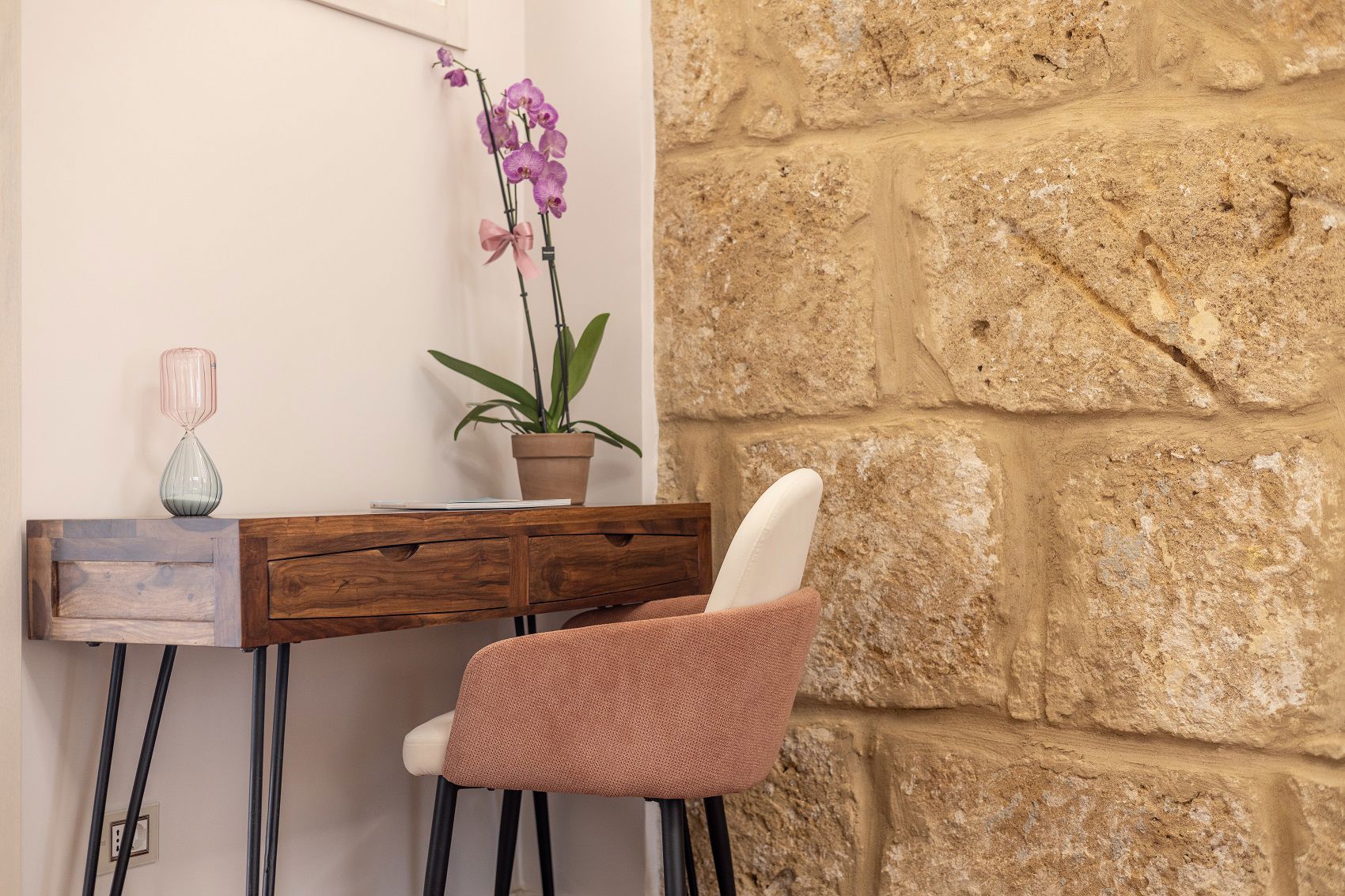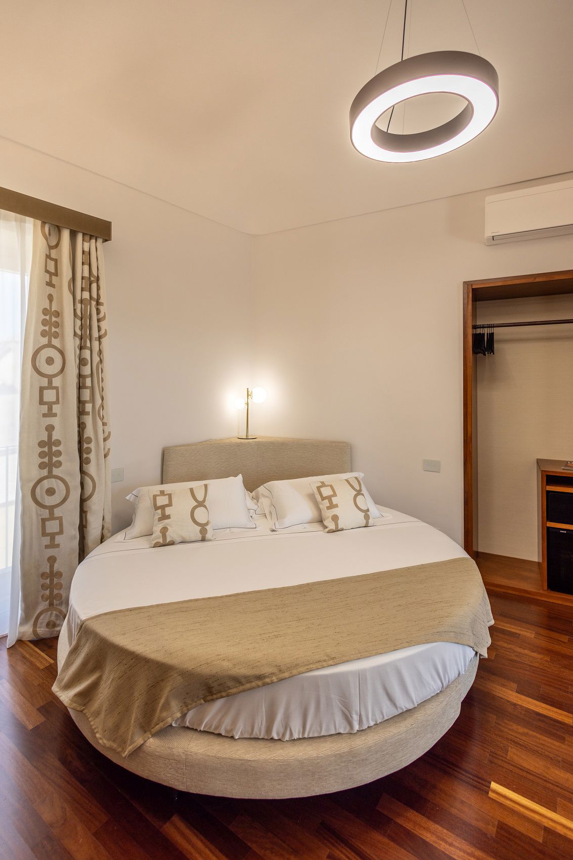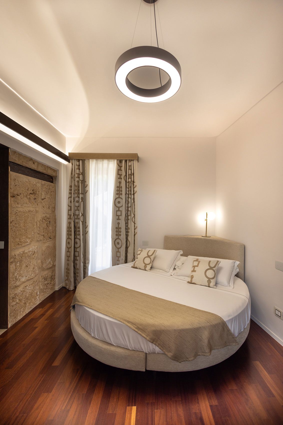 Gli interni, curati nei minimi dettagli, si distinguono per l’utilizzo di tessuti d’autore: la tenda “Alberto” di Pierre Frey – un raffinato ricamo geometrico su raso di lino – dialoga con la testata “Angkor”, dallo stile materico.