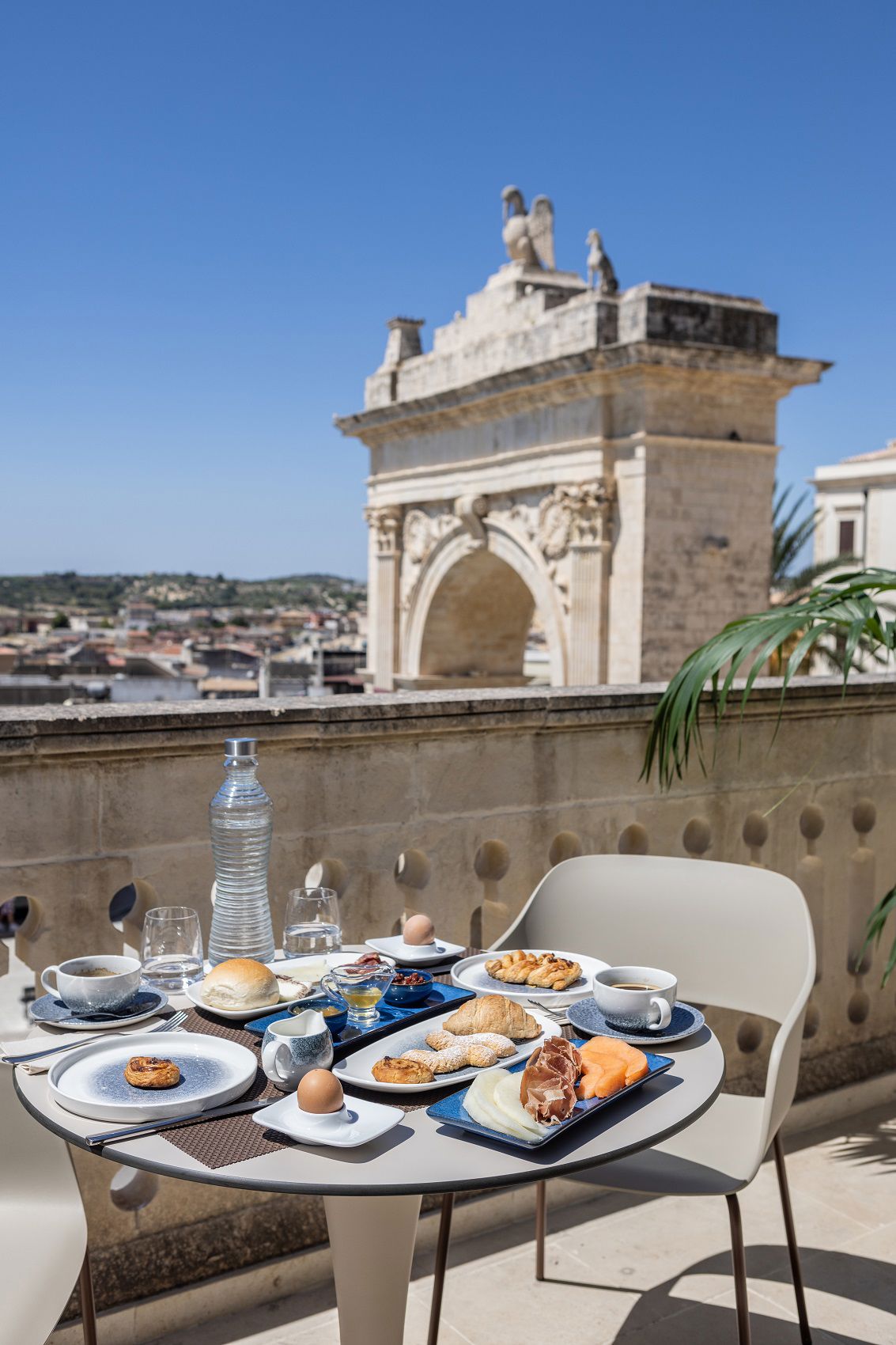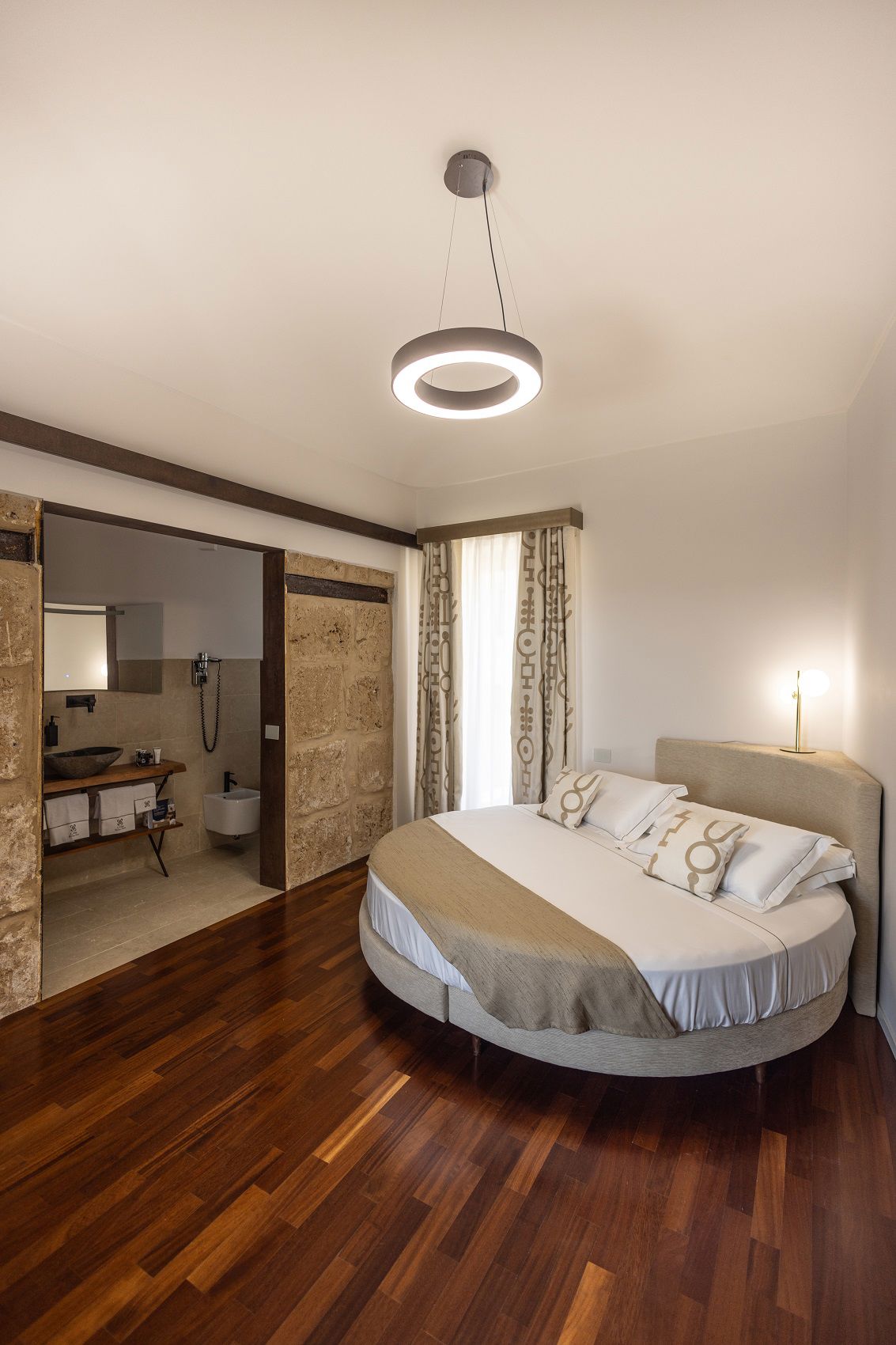 La Junior Suite Terrace accoglie con un elegante roundbed matrimoniale e una zona relax riservata con vasca idromassaggio rotonda in un dehor emozionante, mentre la terrazza privata regala una vista scenografica su Porta Reale.