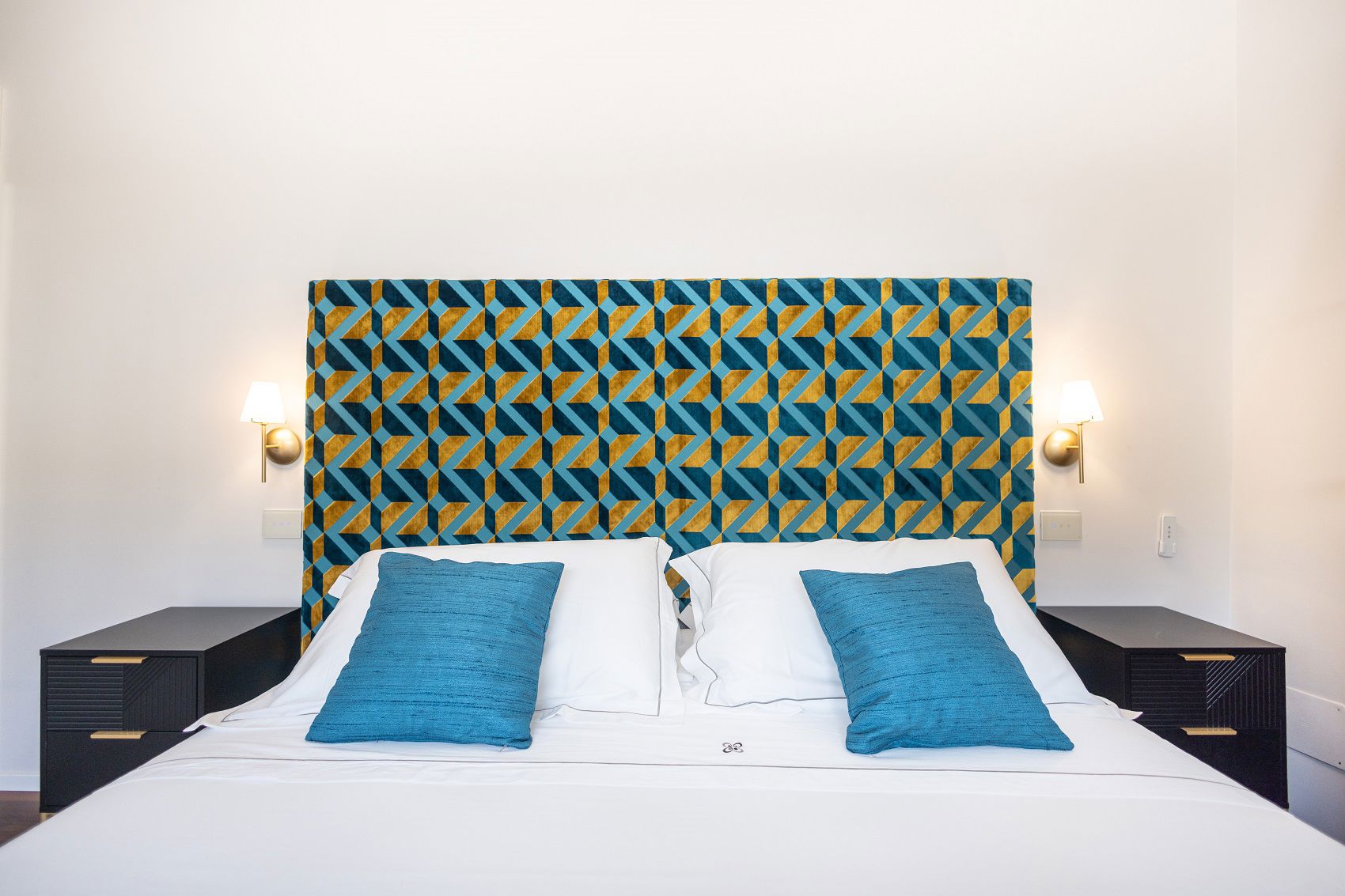 Gli arredi tessili – ricercati, originali, mai convenzionali – raccontano una storia di arte e materia: la testata “Syncopation” di Jim Thompson, ispirata all’Art Déco, abbina velluto geometrico e raso di cotone per un effetto tridimensionale e vibrante, mentre le tende in seta firmata Jim Thompson aggiungono un tocco di leggerezza sofisticata agli ambienti.